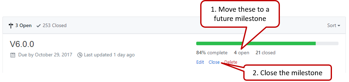 - Update the milestone to match the product i.e., all issues completed and PRs merged for the milestone should be assigned to the milestone. Incomplete issues/PRs should be moved to a future milestone.