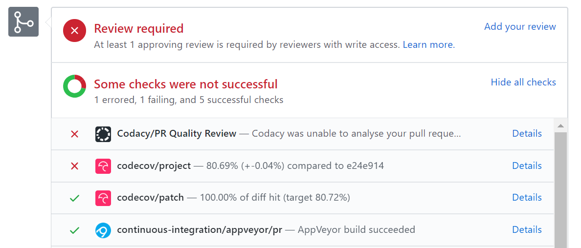 Detailslink in corresponding line to find out more about the failure. Once you figure out the cause of the failure, push a fix to the PR. - An exception to this guideline is when the failure is confirmed to be due to something you can afford to ignore e.g., when CI fails due to a drop in code coverage but the code section that is causing the coverage drop is not practical to be covered by automated tests, or you plan to write the relevant tests at a later time.