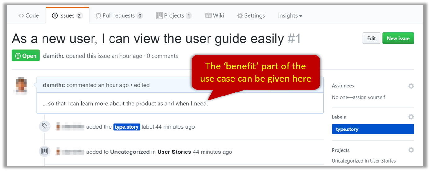 In our project, we use user stories to track user requirements. Instead of using a separate tool for tracking requirements, we can use the GitHub issue tracker for this as well. To do that, record each user story as an issue in the issue tracker. More details (taken from the textbook) are given below. It is optional to use the GitHub issue tracker for recording user stories.