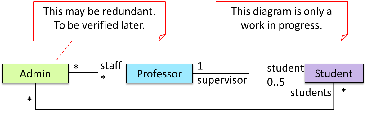 We can clearly see that both Adam and Eve lives in hall h1 (i.e., OK to omit the association label lives in) but we can't see if History is Adam's major or his minor (i.e., the diagram should have included either an association label or a role there). In contrast, we can see Eve is an English major.