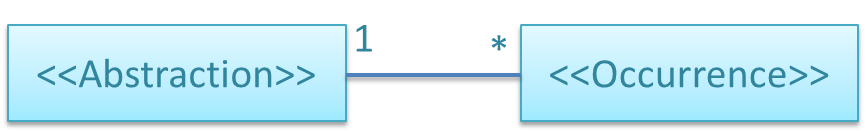 The <<Abstraction>> class should hold all common information, and the unique information should be kept by the <<Occurrence>> class. Note that ‘Abstraction’ and ‘Occurrence’ are not class names, but roles played by each class. Think of this diagram as a meta-model (i.e., a ‘model of a model’) of the BookTitle-BookCopy class diagram given above.