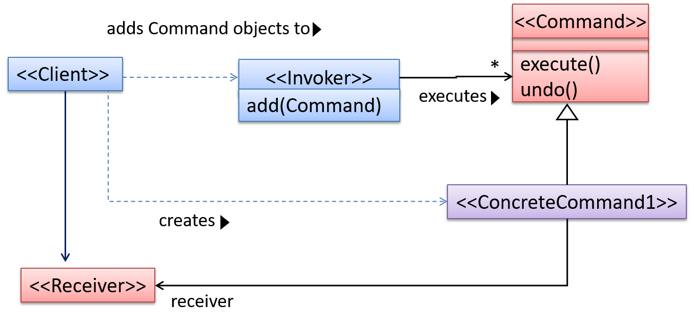 The <<Client>> creates a <<ConcreteCommand>> object, and passes it to the <<Invoker>>. The <<Invoker>> object treats all commands as a general <<Command>> type. <<Invoker>> issues a request by calling execute() on the command. If a command is undoable, <<ConcreteCommand>> will store the state for undoing the command prior to invoking execute(). In addition, the <<ConcreteCommand>> object may have to be linked to any <<Receiver>> of the command () before it is passed to the <<Invoker>>. Note that an application of the command pattern does not have to follow the structure given above.