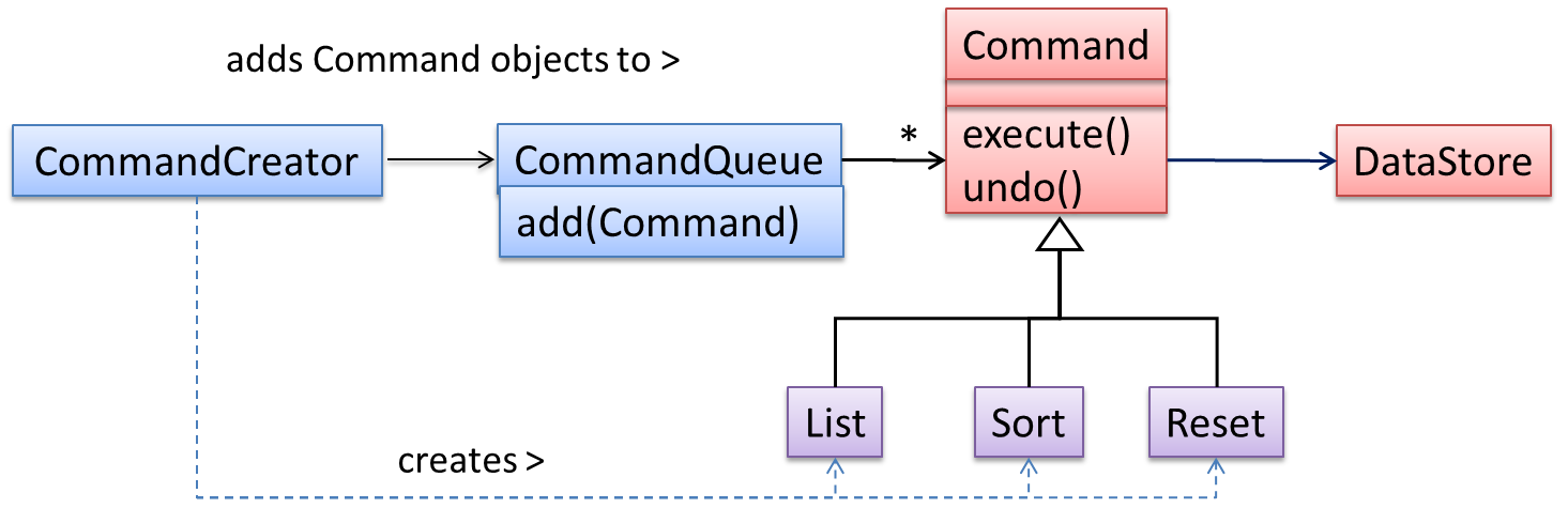 In the example solution below, the CommandCreator creates List, Sort, and Reset Command objects and adds them to the CommandQueue object. The CommandQueue object treats them all as Command objects and performs the execute/undo operation on each of them without knowledge of the specific Command type. When executed, each Command object will access the DataStore object to carry out its task. The Command class can also be an abstract class or an interface.