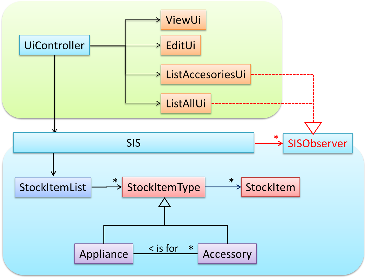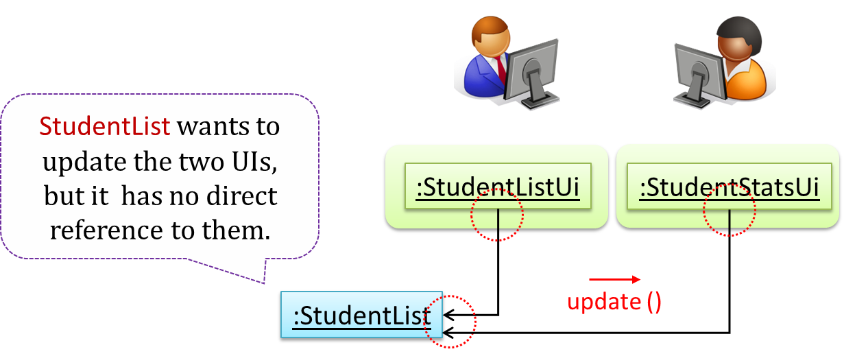 However, the StudentList object has no knowledge about StudentListUi and StudentStatsUi (note the direction of the navigability) and has no way to inform those objects. This is an example of the type of problem addressed by the Observer pattern.