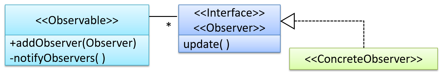 <<Observer>> is an interface: any class that implements it can observe an <<Observable>>. Any number of <<Observer>> objects can observe (i.e., listen to changes of) the <<Observable>> object.<<Observable>> maintains a list of <<Observer>> objects. addObserver(Observer) operation adds a new <<Observer>> to the list of <<Observer>>s.<<Observable>>, the notifyObservers() operation is called that will call the update() operation of all <<Observer>>s in the list.In a GUI application, how is the Controller notified when the “save” button is clicked? UI frameworks such as JavaFX have inbuilt support for the Observer pattern.