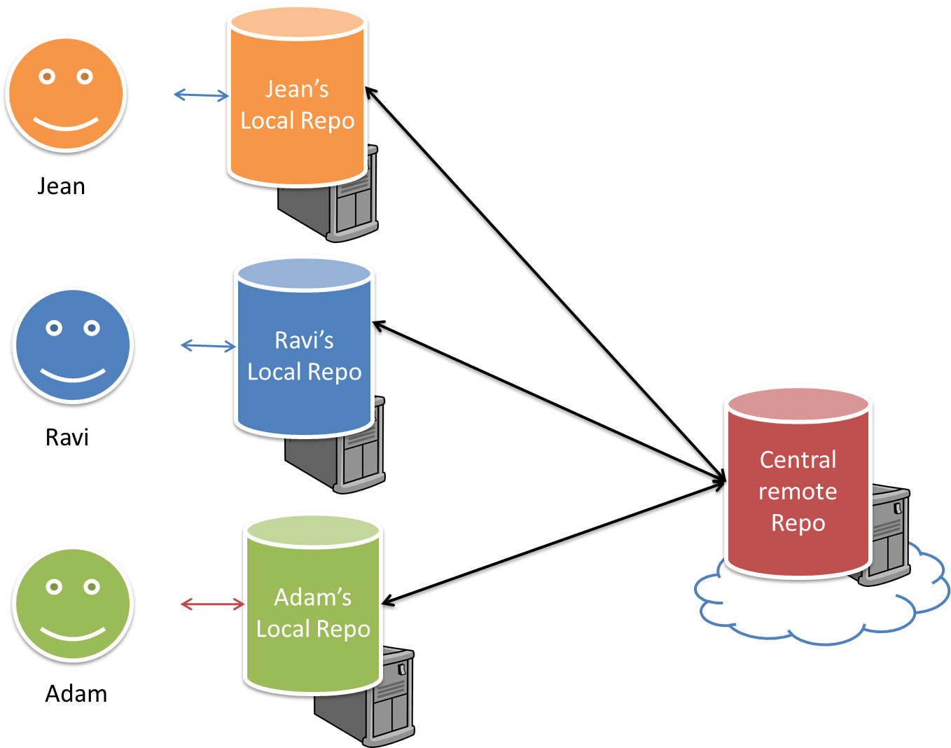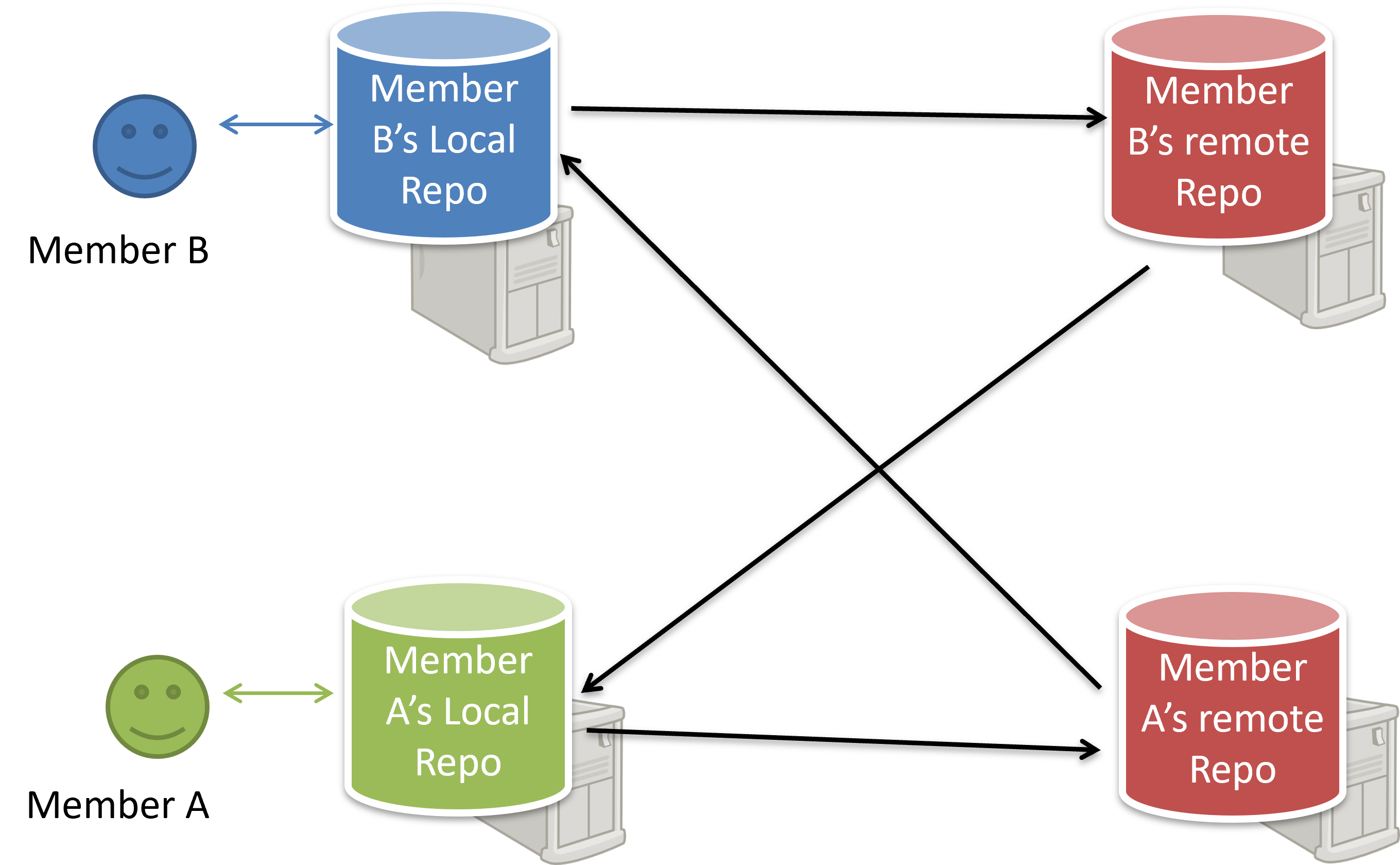 Distributed RCS (DRCS for short, also known as Decentralized RCS) allows multiple remote/local repos working together. The workflow can vary from team to team. For example, every team member can have his/her own remote repository in addition to their own local repository, as shown in the diagram below. Git and Mercurial are some prominent RCS tools that support the distributed approach.