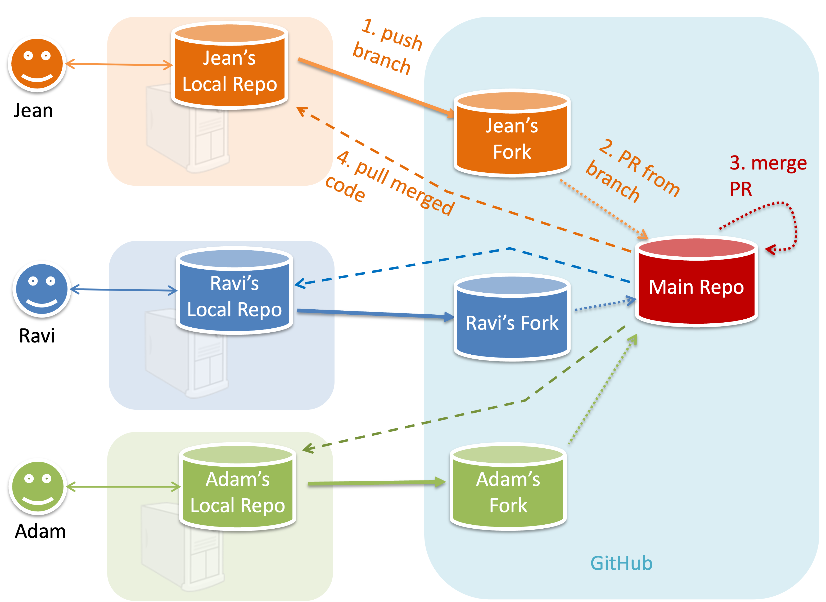 master branch -- if Jean does that, she will not be able to have more than one PR open at any time because any changes to the master branch will be reflected in all open PRs.master branch to each of them.One main benefit of this workflow is that it does not require most contributors to have write permissions to the main repository. Only those who are merging PRs need write permissions. The main drawback of this workflow is the extra overhead of sending everything through forks.