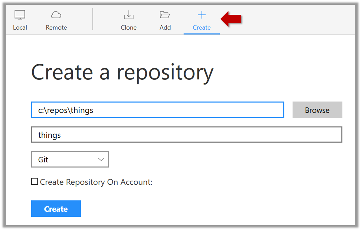 Mac: New... → Create Local Repository (or Create New Repository) → Click ... button to select the folder location for the repository → click the Create button.
