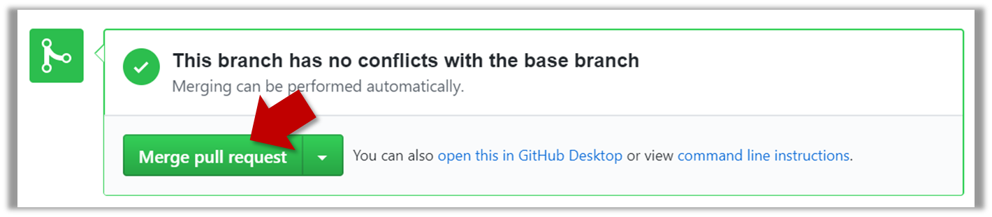 4 Merge the PR by clicking on the Merge pull request button, followed by the Confirm merge button. You should see a Pull request successfully merged and closed message after the PR is merged.