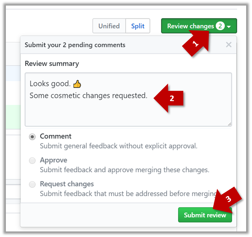 LGTM is often used in such overall comments, to indicate Looks good to me (or Looks good to merge).nit (as in nit-picking) is another such term, used to indicate minor flaws e.g., LGTM. Just a few nits to fix..Approve, Comment, or Request changes option as appropriate and click on the Submit review button.done!