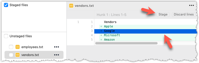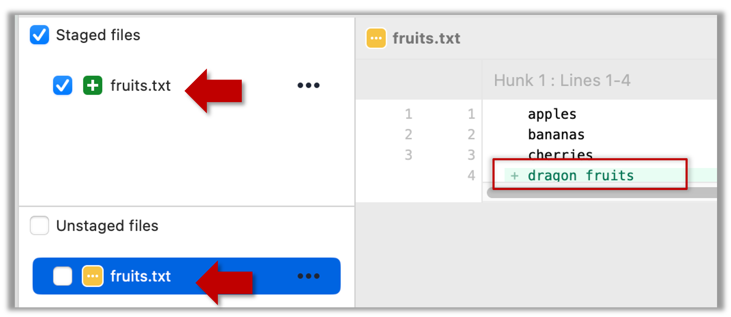 You can replace the add with stage (e.g., git stage fruits.txt) and the result is the same (they are synonyms).