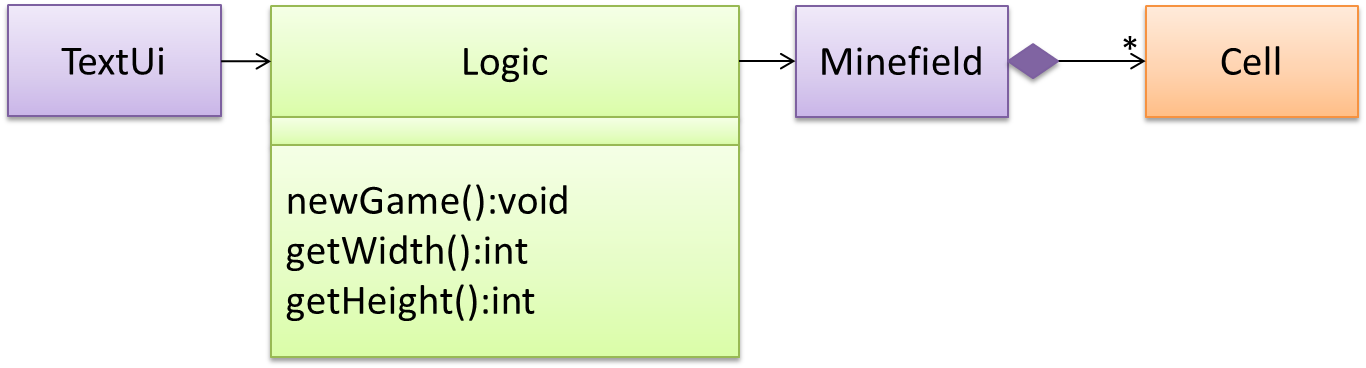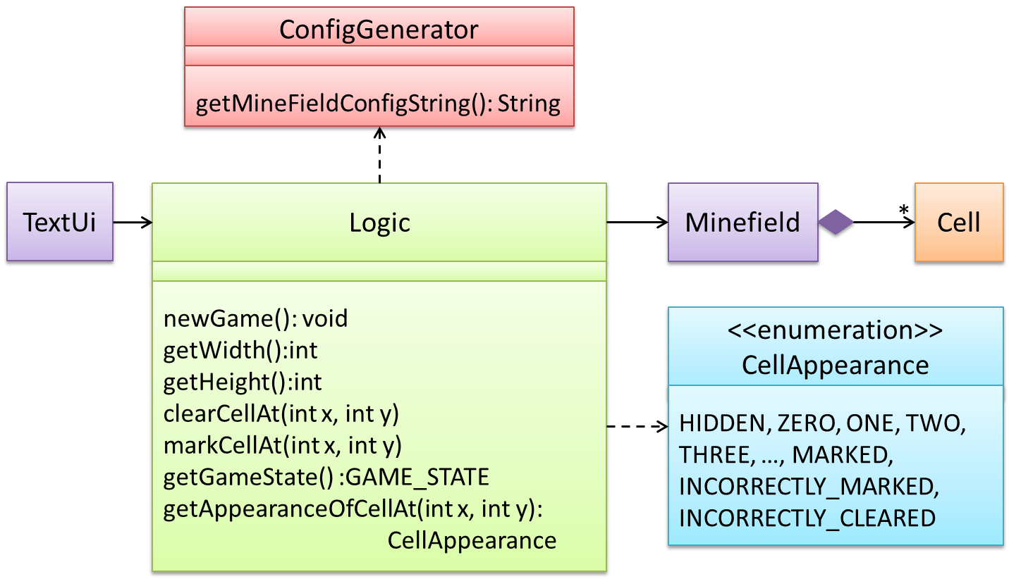 getAppearanceOfCellAt(int,int): CELL_APPEARANCE (CELL_APPEARANCE: HIDDEN, ZERO, ONE, TWO, THREE, …, MARKED, INCORRECTLY_MARKED, INCORRECTLY_CLEARED)In the above design, TextUi does not access Cell objects directly. Instead, it gets values of type CELL_APPEARANCE from Logic to be displayed as a minefield to the player. Alternatively, each cell or the entire minefield can be passed directly to TextUi.