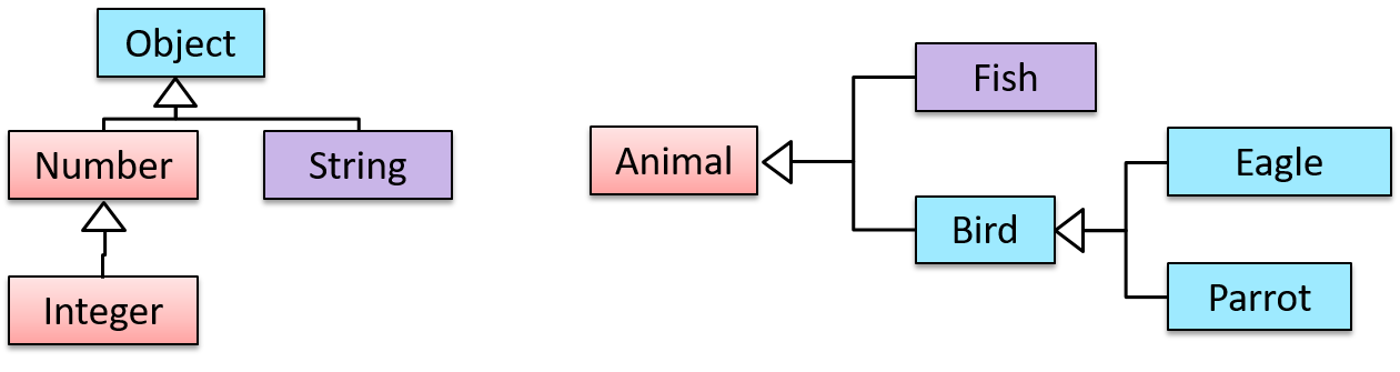 Two inheritance hierarchies/trees are given below. Note that the triangle points to the parent class. Observe how the Parrot is a Bird as well as it is an Animal.