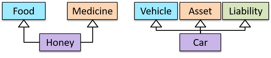 The Honey class inherits from the Food class and the Medicine class because honey can be consumed as a food as well as a medicine (in some oriental medicine practices). Similarly, a Car is a Vehicle, an Asset and a Liability.