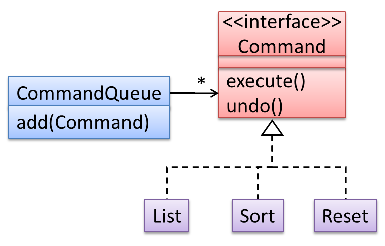 In the design given below, the behavior of the CommandQueue class can be altered by adding more concrete Command subclasses. For example, by including a Delete class alongside List, Sort, and Reset, the CommandQueue can now perform delete commands without modifying its code at all. That is, its behavior was extended without having to modify its code. Hence, it is open to extensions, but closed to modification.