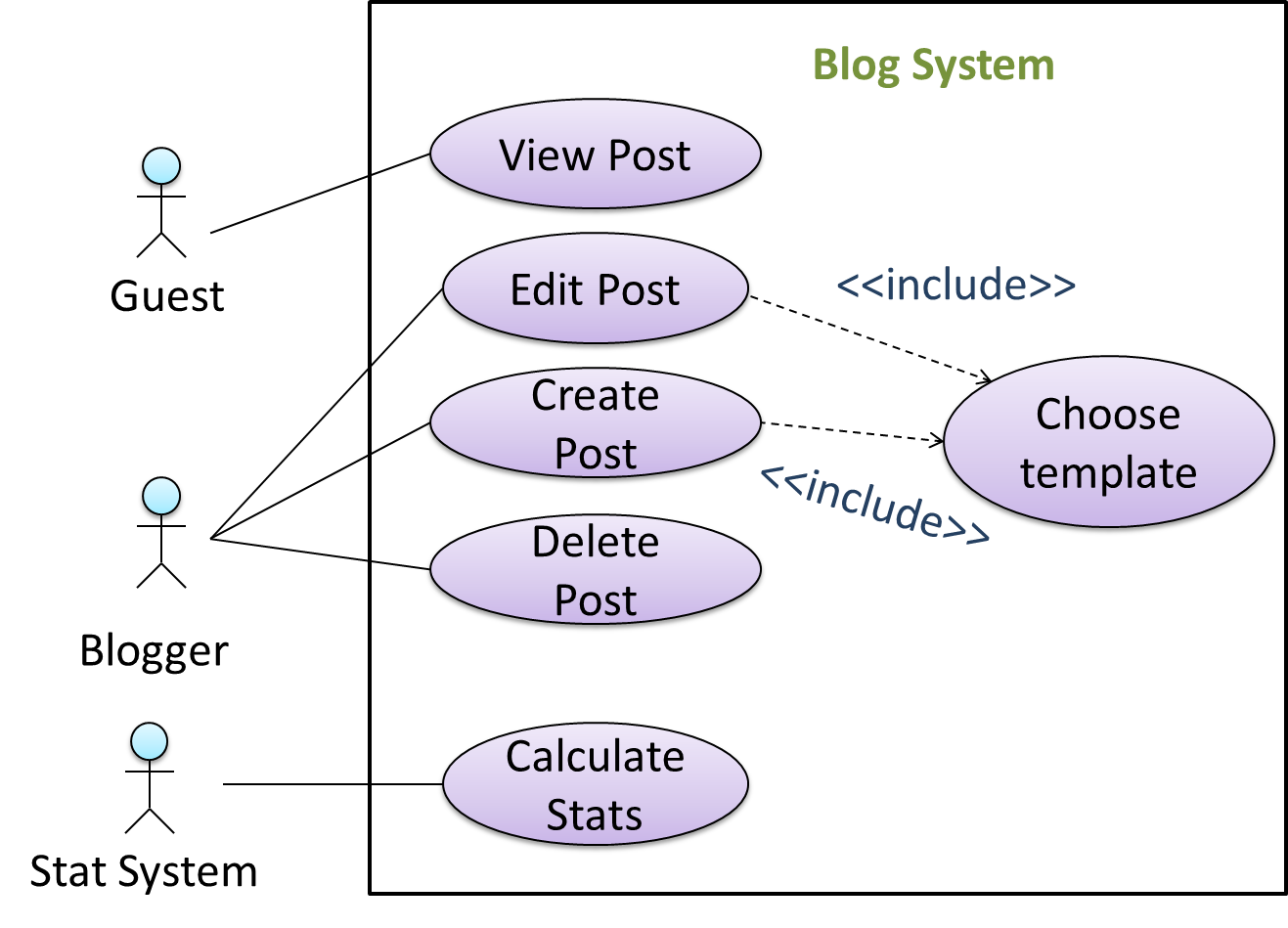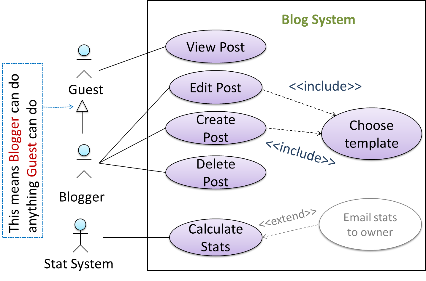 In this example, actor Blogger can do all the use cases the actor Guest can do, as a result of the actor generalization relationship given in the diagram.