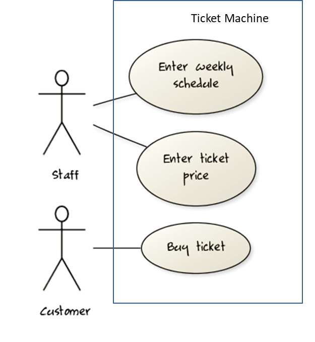 In the example on the right, note how use cases are shown as ovals and user roles relevant to each use case are shown as stick figures connected to the corresponding ovals.