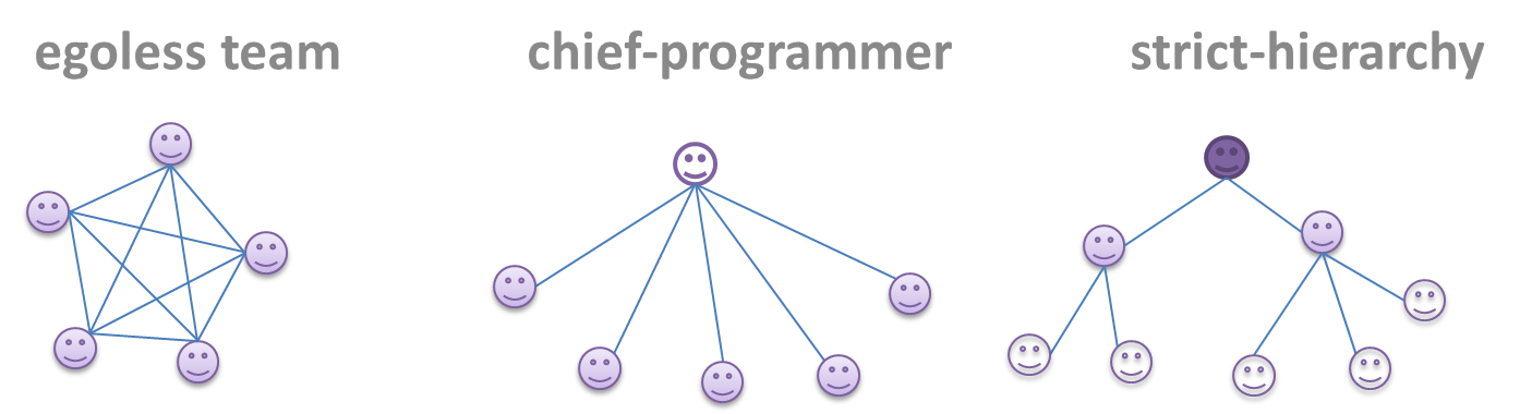 Given below are three commonly used team structures in software development. Irrespective of the team structure, it is a good practice to assign roles and responsibilities to different team members so that someone is clearly in charge of each aspect of the project. In comparison, the ‘everybody is responsible for everything’ approach can result in more chaos and hence slower progress.